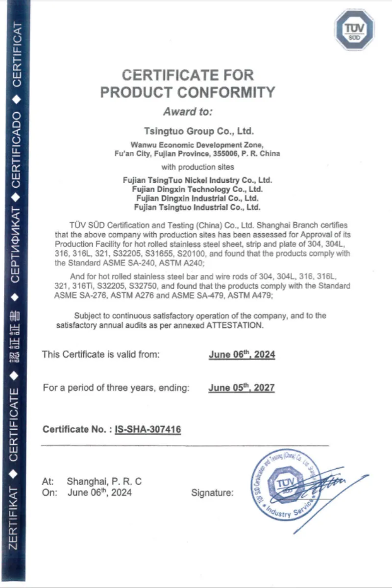 此次認(rèn)證范圍涵蓋福建青拓鎳業(yè)有限公司、福建鼎信科技有限公司、福建鼎信實(shí)業(yè)有限公司、福建青拓實(shí)業(yè)股份有限公司,產(chǎn)品包括熱軋不銹鋼卷帶、板材、棒材、盤(pán)條(牌號(hào)涉及304、304 L、316、316 L、321、316 Ti、S32205、S32750等),經(jīng)TüV南德取樣測(cè)試,認(rèn)證產(chǎn)品性能符合AS ME SA240/ASTM A240、AS ME SA276/ASTM A276和AS ME SA479/ASTM A479標(biāo)準(zhǔn)要求及產(chǎn)品性能要求。